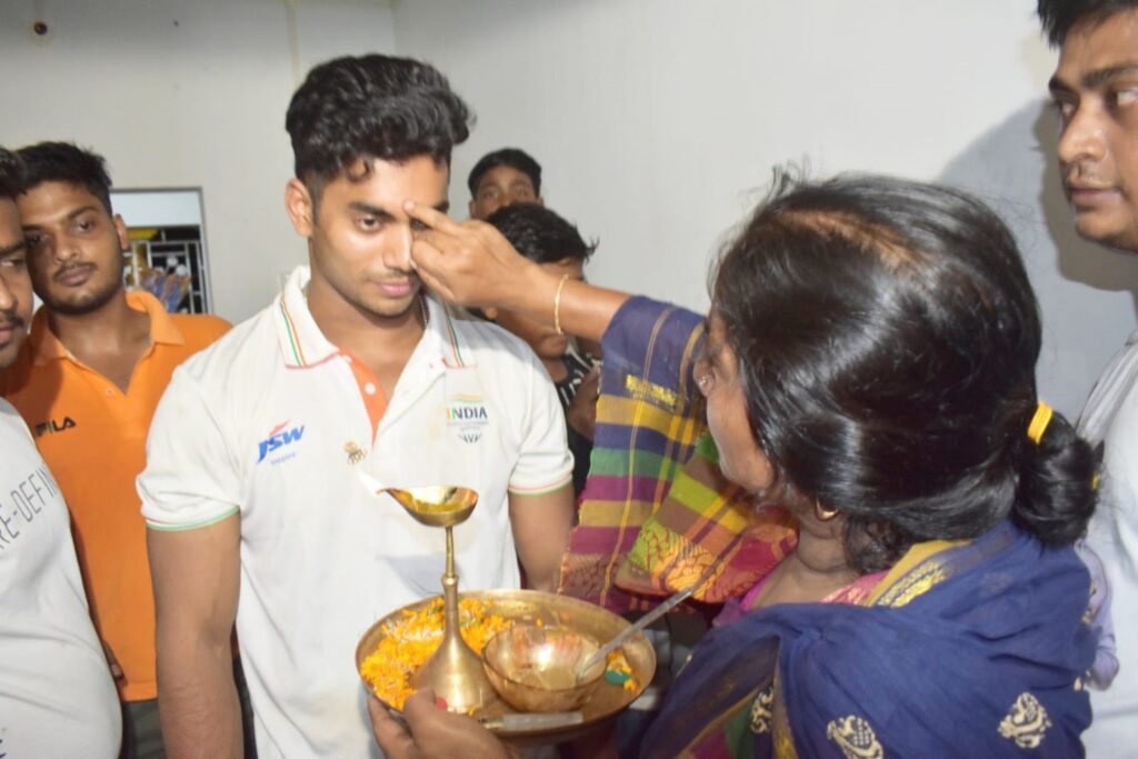 সোমবার অচিন্ত্যকে বিমানবন্দর থেকে আনতে গিয়েছিলেন দাদা অলোক শিউলি এবং অচিন্ত্যর প্রথম কোচ অষ্টম দাস। রাত ১১ নাগাদ অচিন্ত্য দেউলপুরে পৌঁছাতেই উল্লাসে ফেটে পড়েছিল জনতা। জাতীয় পতাকা উড়িয়ে, বাজি ফাটিয়ে, শঙ্খ ধ্বনি দিয়ে বরণ করে নিয়েছিল সোনার ছেলেকে। অচিন্ত্য প্রথমে কোচ অষ্টম দাসের বাড়িতে যায় পরে নিজের বাড়িতে আসে। সেখানে মা পূর্ণিমা শিউলি বরণ করে ছেলেকে ঘরে তোলেন। পরের ছেলের পছন্দ মত কড়াইশুঁটির কচুরি আর চানা মশলা খেতে দেন। সোমবারের পর মঙ্গলবারেও দুপুরে অচিন্ত্যের জন্য রান্না হয়েছিল মুরগির মাংসের ঝোল আর ভাত।