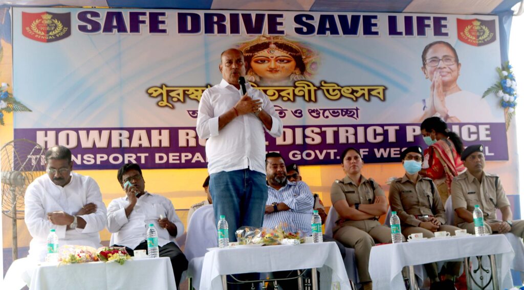 এদিনের এই অনুষ্ঠানে অন্যদের মধ্যে উপস্থিত ছিলন রাজ্যের পূর্ত মন্ত্রী পুলক রায়, হাওড়া গ্রামীণ জেলা পুলিশ সুপার স্বাথী ভাঙ্গালিয়া, অতিরিক্ত পুলিশ সুপার (হেড কোর্য়াটার ) অলোকনন্দা ভাওয়াল, বিধায়ক অরুনাভ সেন, উলুবেড়িয়া পুরসভার চেয়ারম্যান অভয় দাস, ভাইস চেয়ারম্যান ইনামুর রহমান সহ অন্যান্যরা। এদিনের এই অনুষ্ঠান মঞ্চ থেকে দুর্গা পুজোয় সেফ ড্রাইভ সেভ লাইভ থিম. ডিসপ্লে এবং সচেতনতামূলক প্রচারের পাশাপাশি মানুষকে সচেতন করার জন্য হাওড়া গ্রামীণ জেলা পুলিশের পক্ষ থেকে উলুবেড়িয়া নোনা অ্যাথালেটিক ক্লাব, ফুলেশ্বর কোটালঘাটা নবোদয় সংঘ এবং বাগনান খালোড় যুব সঙ্ঘকে পুরস্কৃত করা হয়। পুলিশ সুপার স্বাথী ভাঙ্গালিয়া বলেন সেফ ড্রাইভ সেভ লাইফ নিয়ে মানুষকে সচেতন করার পাশাপাশি জন্য বেপরোয়া অ্যাম্বুলেন্স চালানো রূখতে অ্যাম্বুলেন্স চালকদের ও সচেতন করার উদ্যোগ নেওয়া হয়েছে। শুক্রবার এই অনুষ্ঠান শুরু হলেও আগামীদিনে প্রতিটি হাসপাতালে গিয়ে অ্যাম্বুলেন্স চালকদের সচেতন করা হবে।