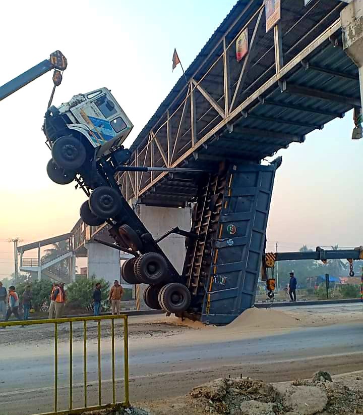 নিজস্ব প্রতিনিধি, হাওড়া নিউজ ২৪, উলুবেড়িয়া- ডাম্পারের ডালা খুলে জাতীয় সড়কের উপরে থাকা ফুট ওভার ব্রীজের নীচে আটকে গেল। দূর্ঘটনাটি ঘটেছে মঙ্গলবার গভীর রাতে ১৬ নং জাতীয় সড়কে উলুবেড়িয়া থানার জেলেপাড়া ব্রীজের কাছে। ঘটনায় জাতীয় সড়কে যান চলাচল ব্যাহত হয়। পরে বুধবার সকালে ৩টি ক্রেনের সাহায্যে ফুট ওভার ব্রীজের নীচ থেকে ডাম্পারটিকে সরিয়ে যান চলাচল স্বাভাবিক করা হয়।