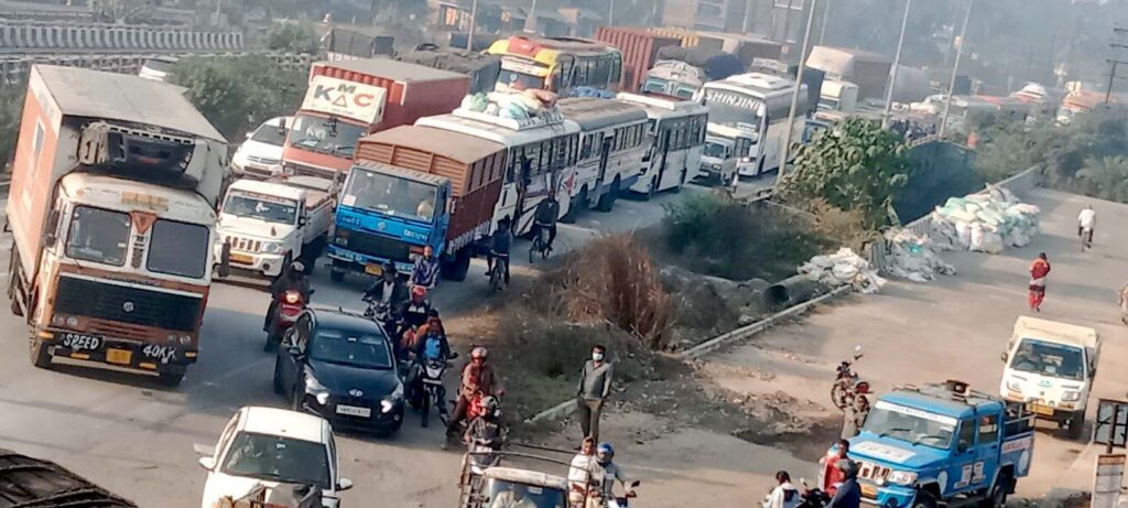 জাতীয় সড়কে ফুট ওভার ব্রীজের নীচে আটকে গেল ডাম্পার
